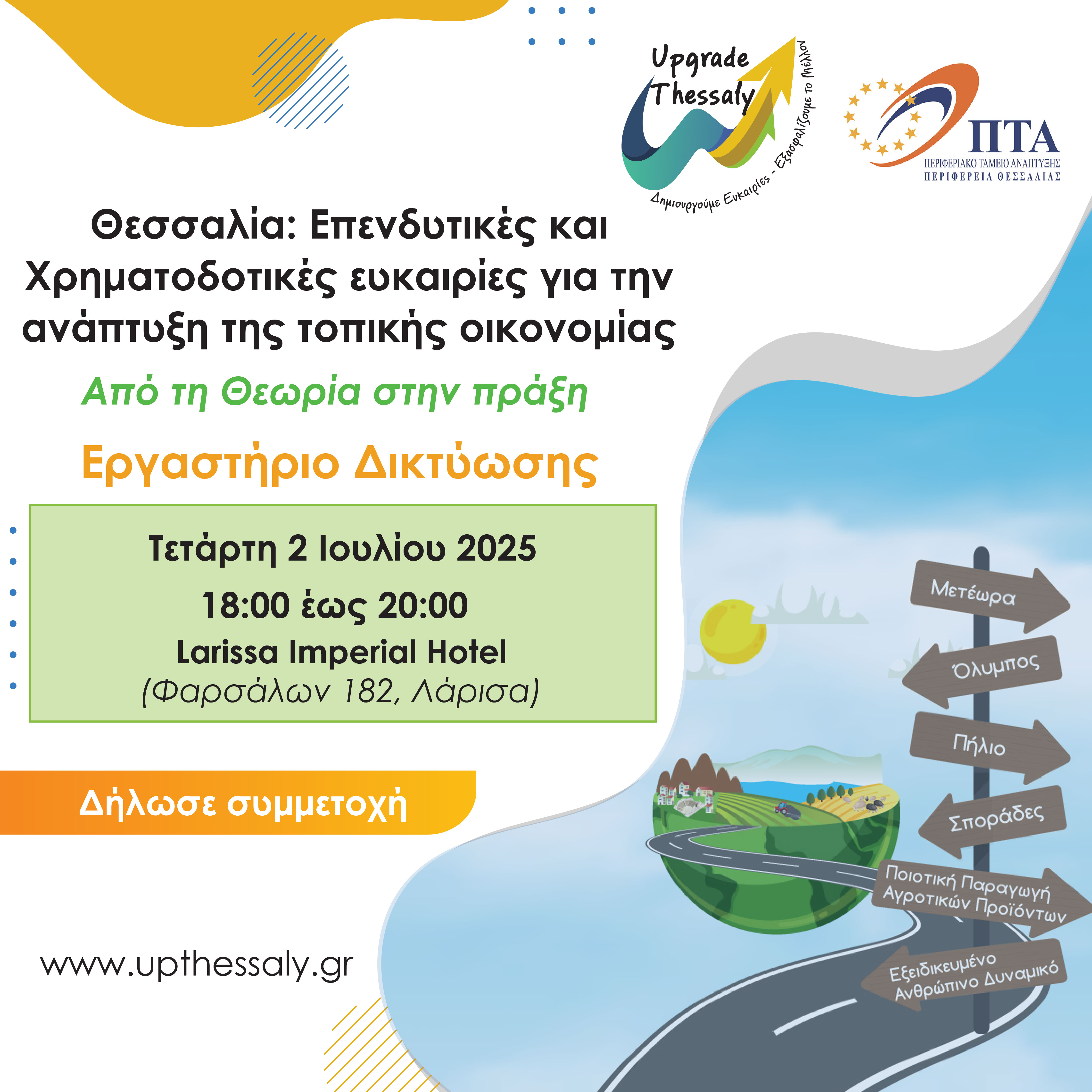 Θεσσαλία: Επενδυτικές και Χρηματοδοτικές ευκαιρίες για την ανάπτυξη της τοπικής οικονομίας Από τη Θεωρία στην πράξη – 2ο Εργαστήριο Δικτύωσης, Λάρισα 02/07/2025